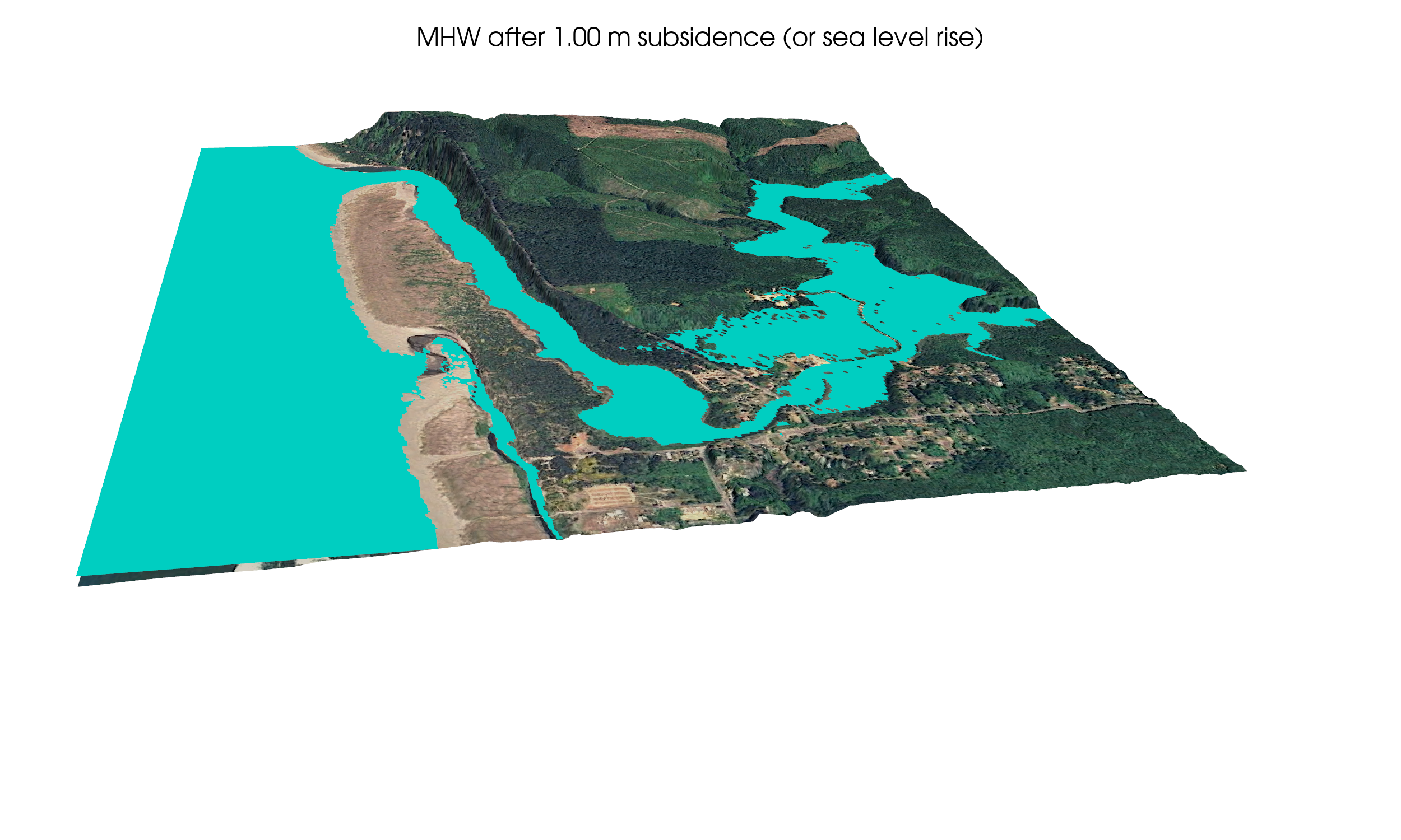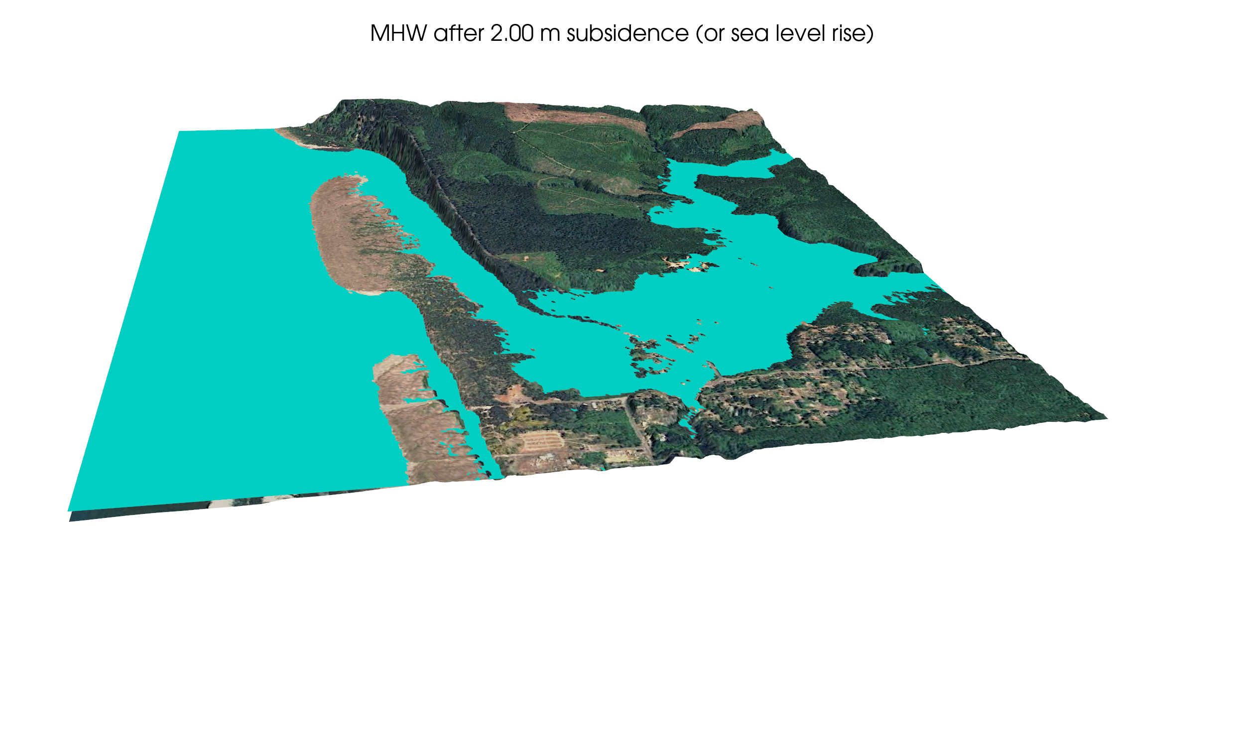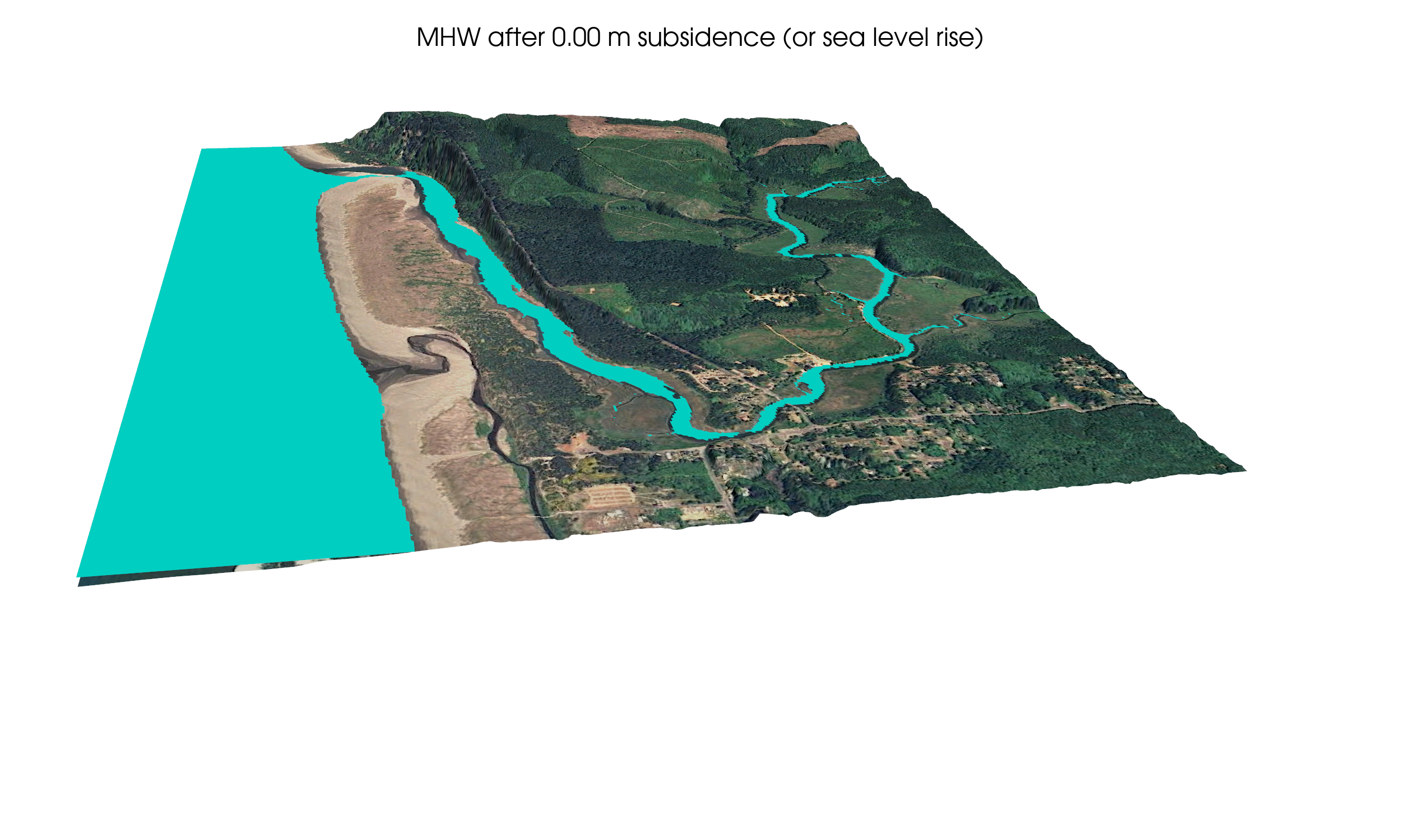 The water surface at the current MHW is shown in plots above. These snapshots show two elevated levels.