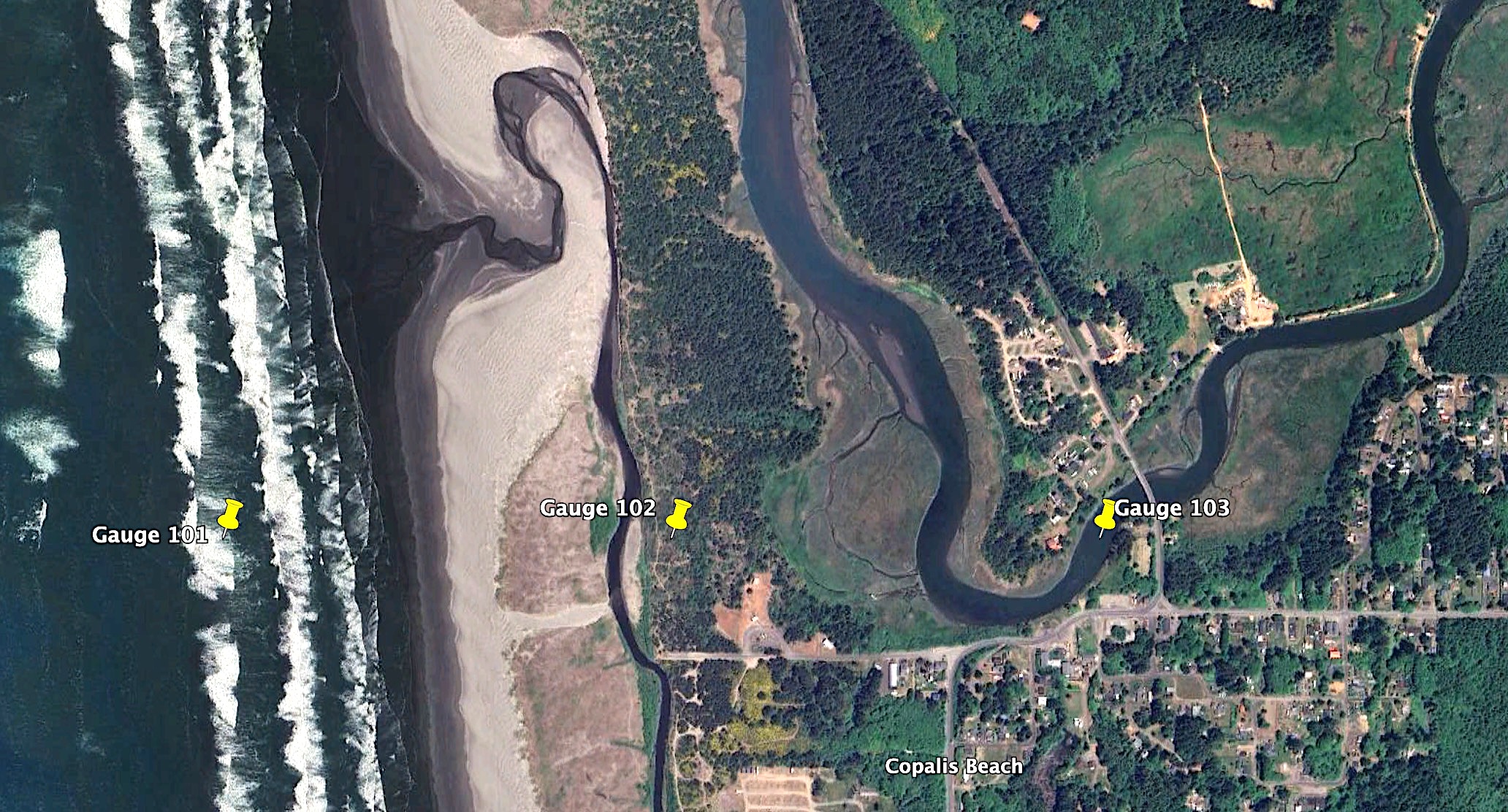 gauges.append([103, -124.1706019, 47.1159722, 0, 1e9]) # in riverThe gauges.kml file created from any of these setrun files