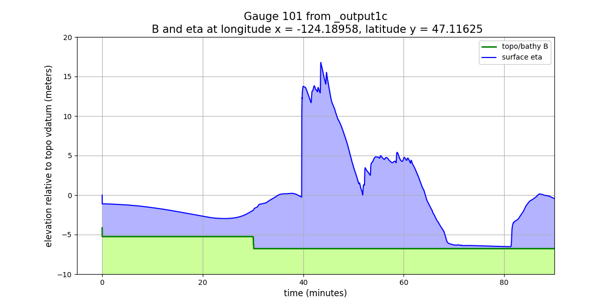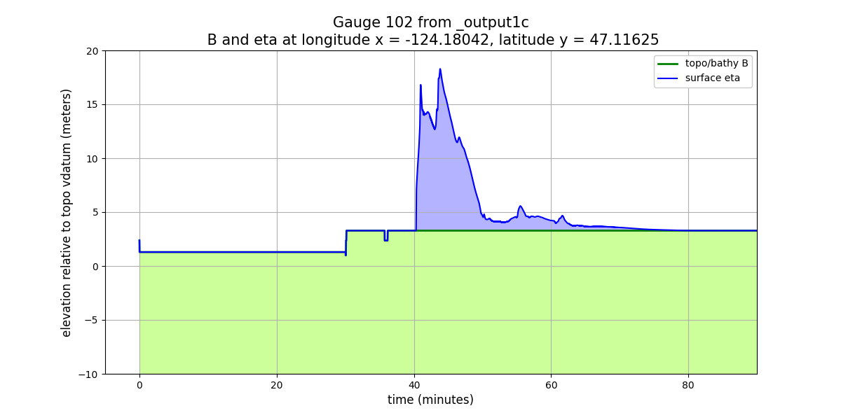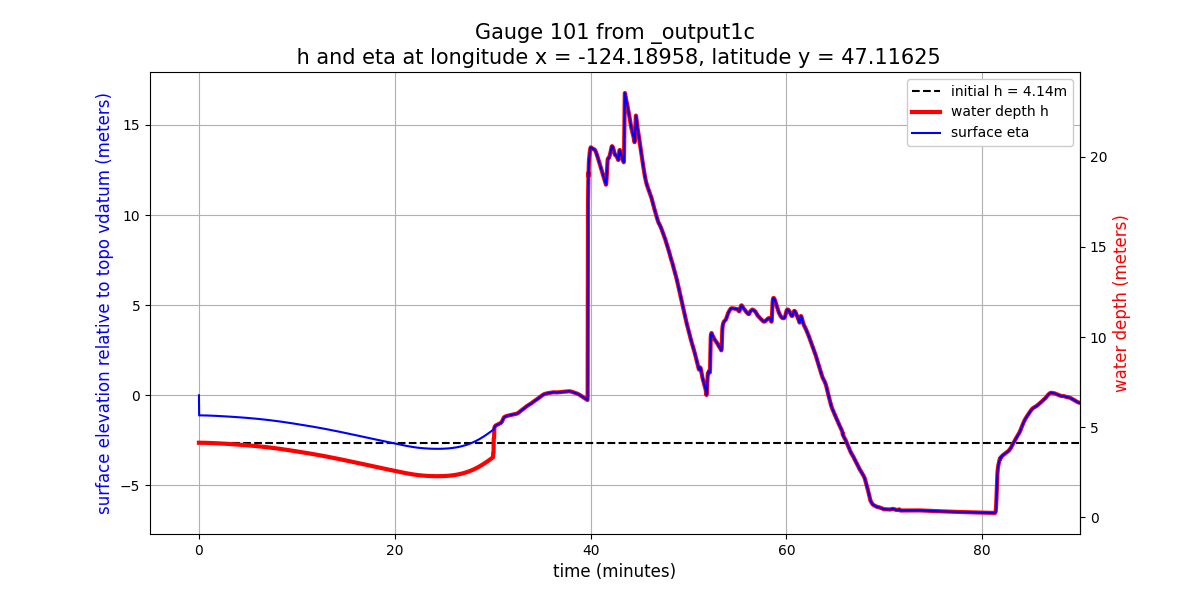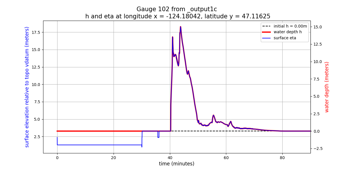 eta = h + B(wherehis the water depth andBis the topography) is shown in meters relative to the vertical datum of the underlying topofileCopalis_13s.ascused in GeoClaw, since this is the finest-resolution topofile available at this gauge location (see TBD for more discussion of this). The way this topofile was created in Make topofiles for Copalis Beach, the vertical datum is (approximately) Mean High Water (MHW) at this location.The surface elevation plot shows a discontinuity in elevation just after time 0. This shows that this earthquake event has some co-seismic subsidence at the location of this gauge. As the land drops, the ocean drops with it and so the height of the jump discontinuity seen just after time 0 shows the magnitude of the subsidence at this location. (Add python code to show how this can be computed from gauge output).