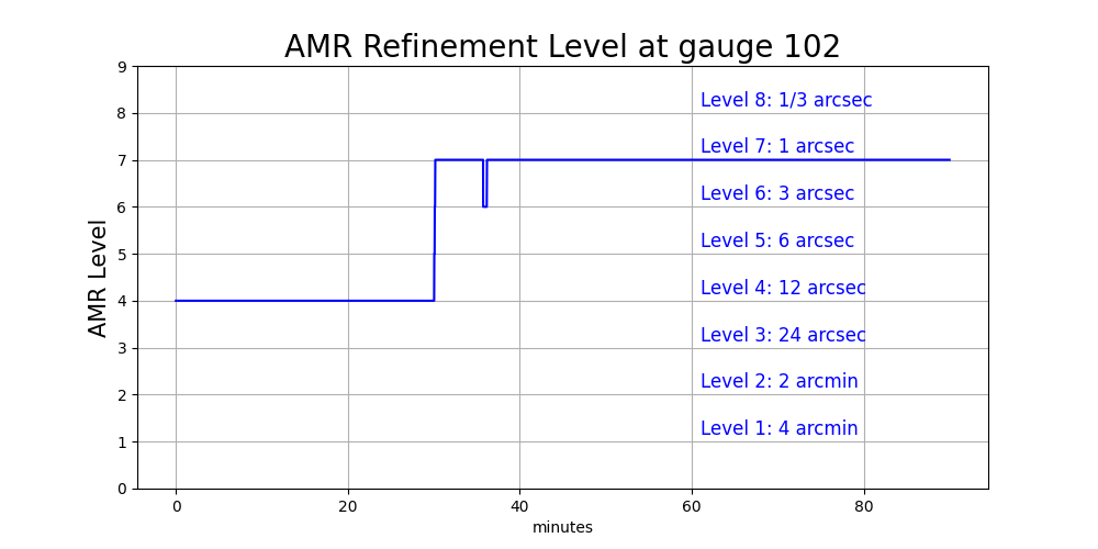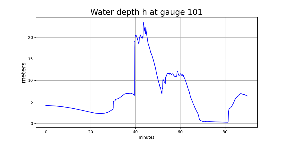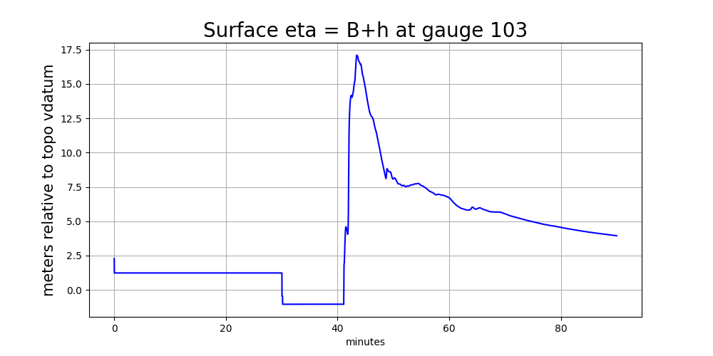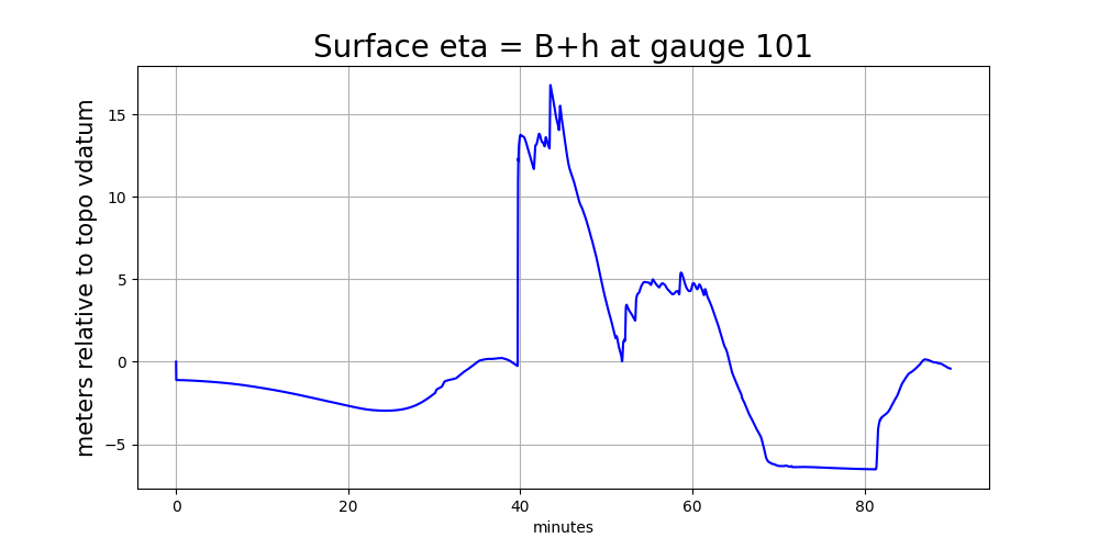 Bdue to AMR refinement and so Gauge 101 is now in a level 7 grid cell with a smaller cell-averagedBvalue than the level 4 grid cell it lies in. The water depth on the new finer grid patches was initialized so that the water surfaceetadid not change (which required filling the cell with more water (largerh) than the original level 4 cell).