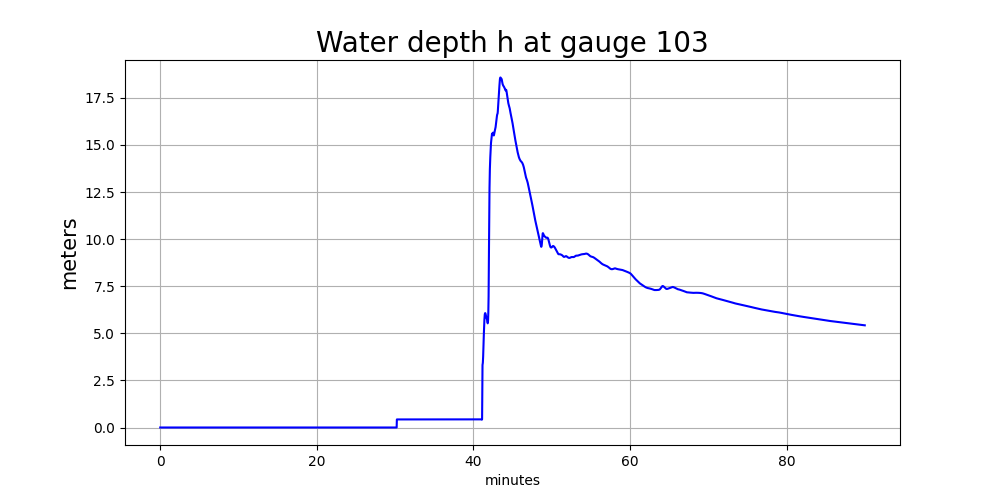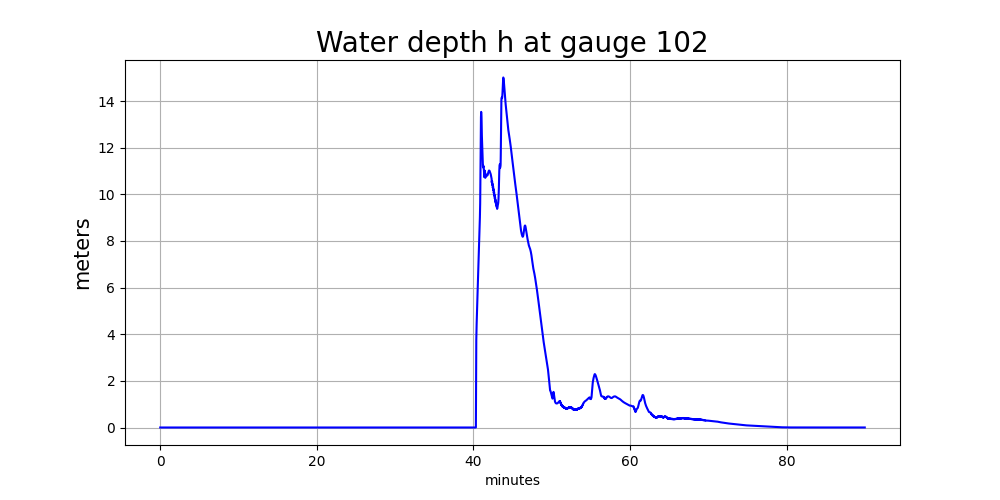 The main tsunami wave arrives at about 40 minutes, and both the surface elevation and water depth appear to rise almost discontinuously at this time. The shallow water equations we solve allow the formation of hydraulic jumps (shock waves) that roughly model the large bore that will be created when the huge leading wave of the tsunami shoals and breaks in the shallow water just offshore.