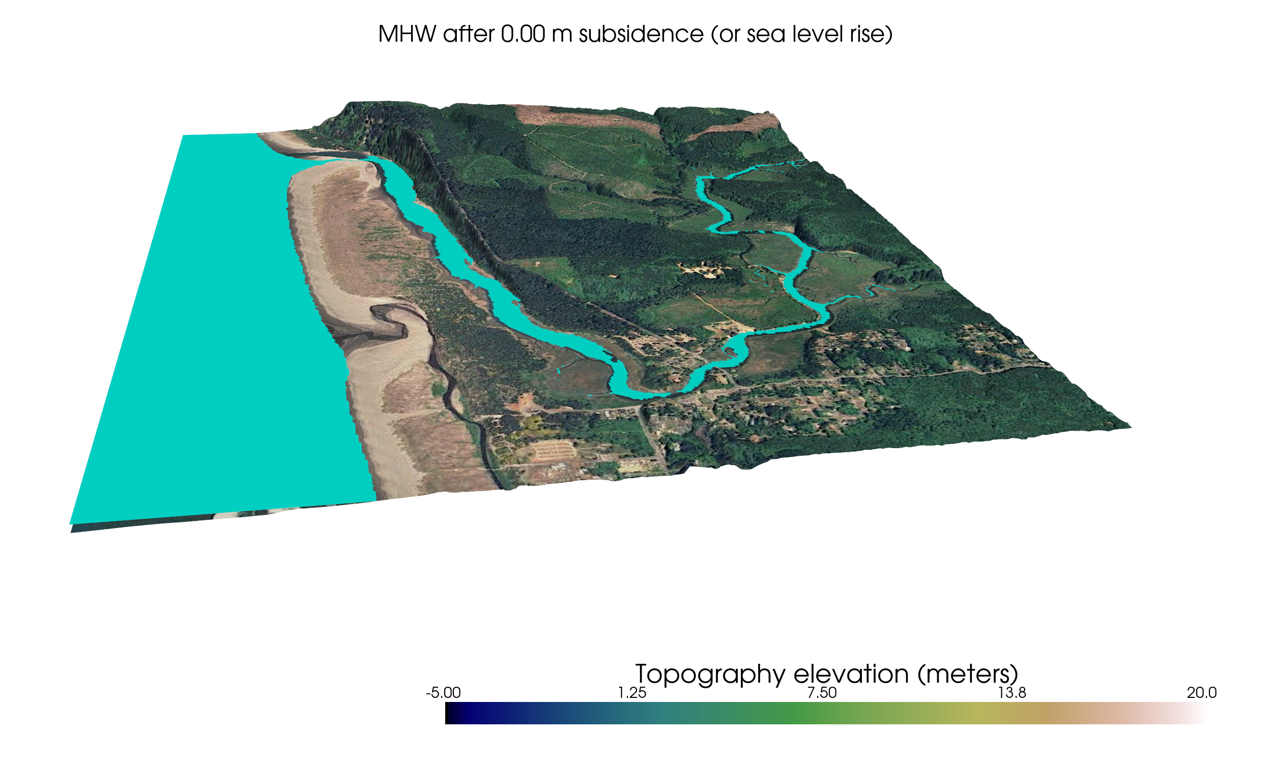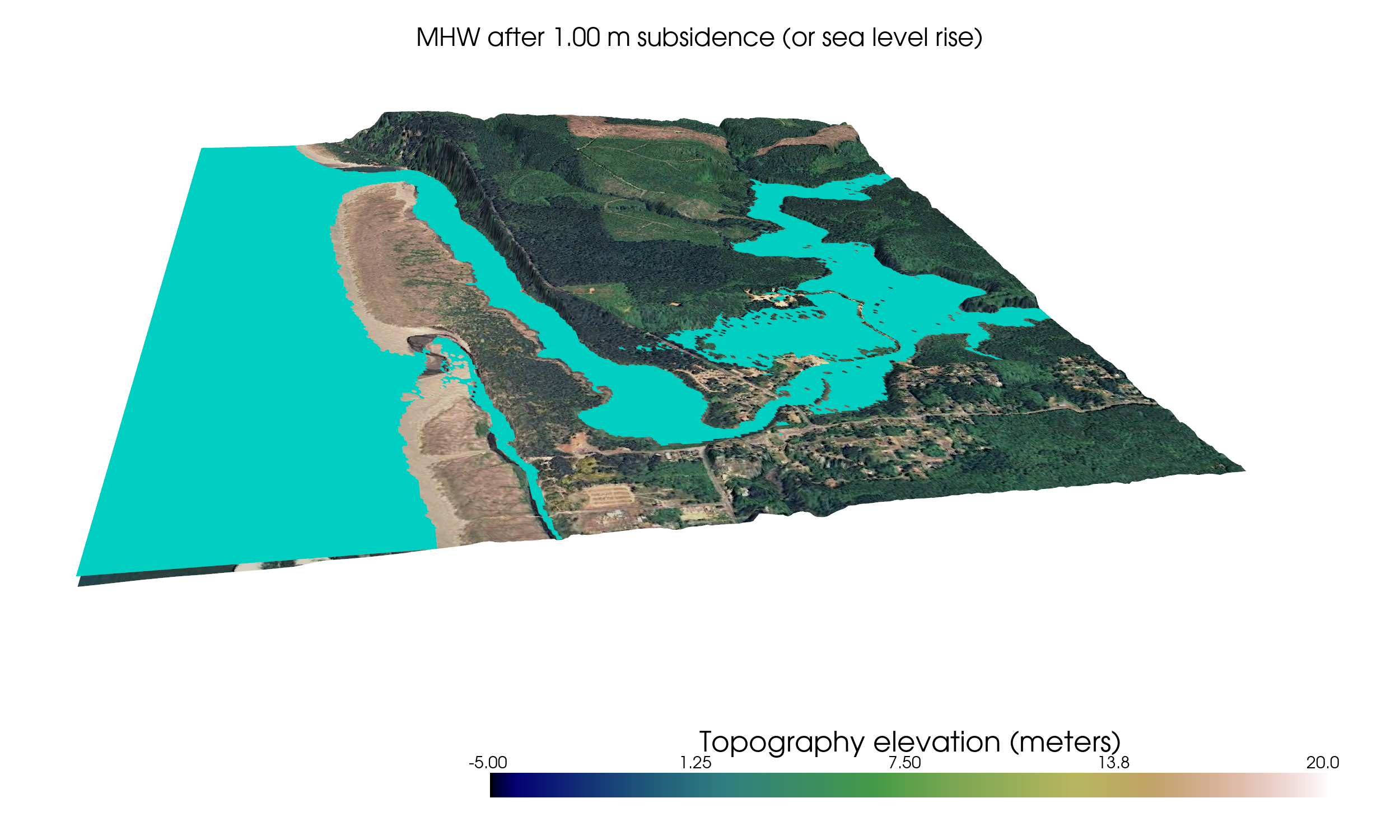 The snapshots below show the water surface at four different levels: at MHW and at 1, 2, or 3 meters above MHW.
